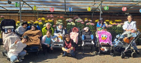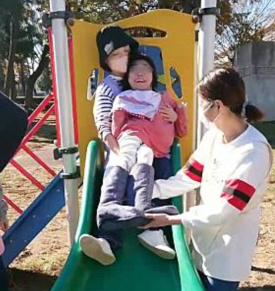 花畑公園では、すべりだい遊び。順番にスタッフと一緒に『シューー』っと滑る感覚を楽しみました。どの子も、終わった後にとても嬉しそうな顔をしていました。車いすで落ち葉をふんで『カサガサ、カサガサ』の音も楽しみました。