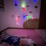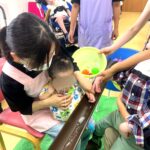 夏といえば、「海」ということで、折り紙や画用紙で魚やタコ、カニなどの海の生き物を作りました。部屋の壁に貼ると、可愛い水槽のよう。風船やセロファン紙で作った魚も天井からぶら下げました。ここまでできたところでどんぐり水族館の開館!大きなサメも登場してびっくり!上手に作った海の生き物を見て、水族館気分を味わいました。
