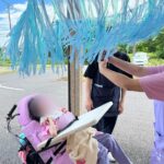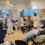 雨降りの季節を感じるミュージックケアを行いました。七色のすずらんテープをつけた傘や鈴をつけた傘を雨の曲に合わせて振ったり回したりすると、うっとおしい梅雨の季節も楽しく感じてきます。スタッフの工夫が活きた手作りのグッズが活躍しました。
