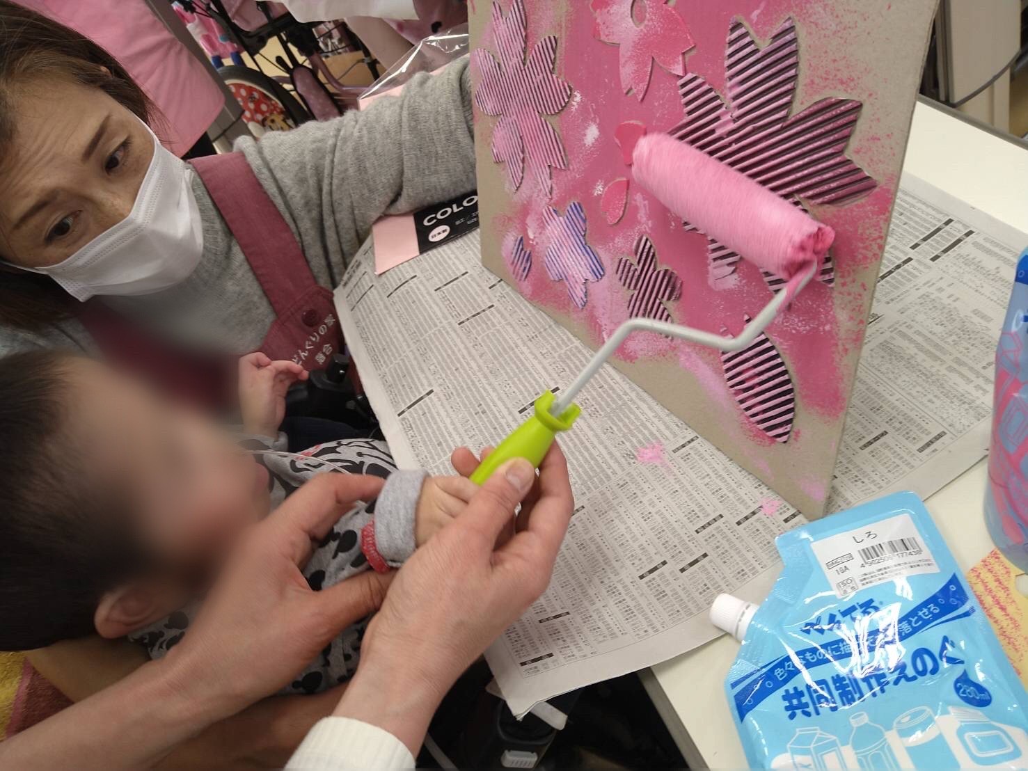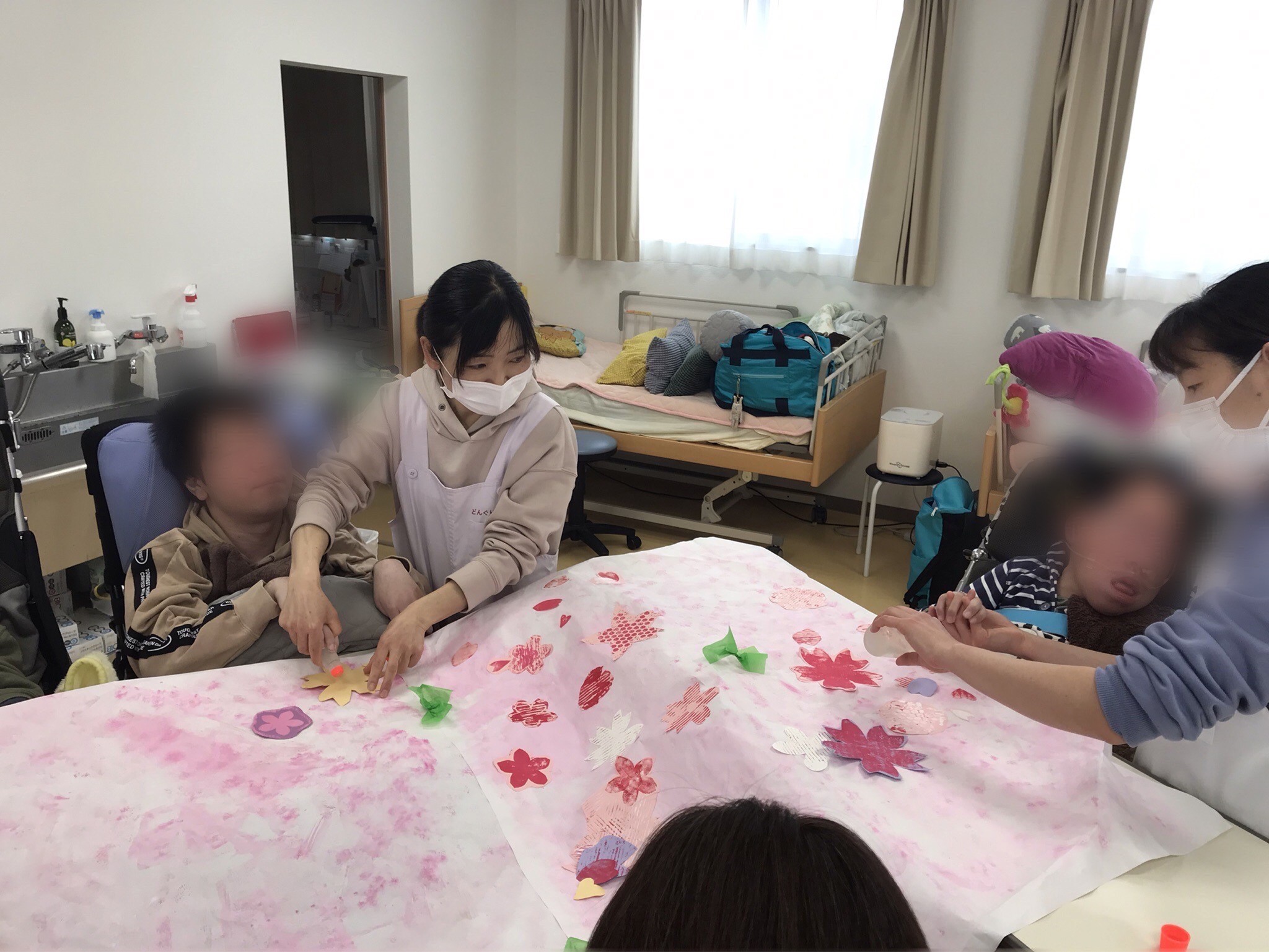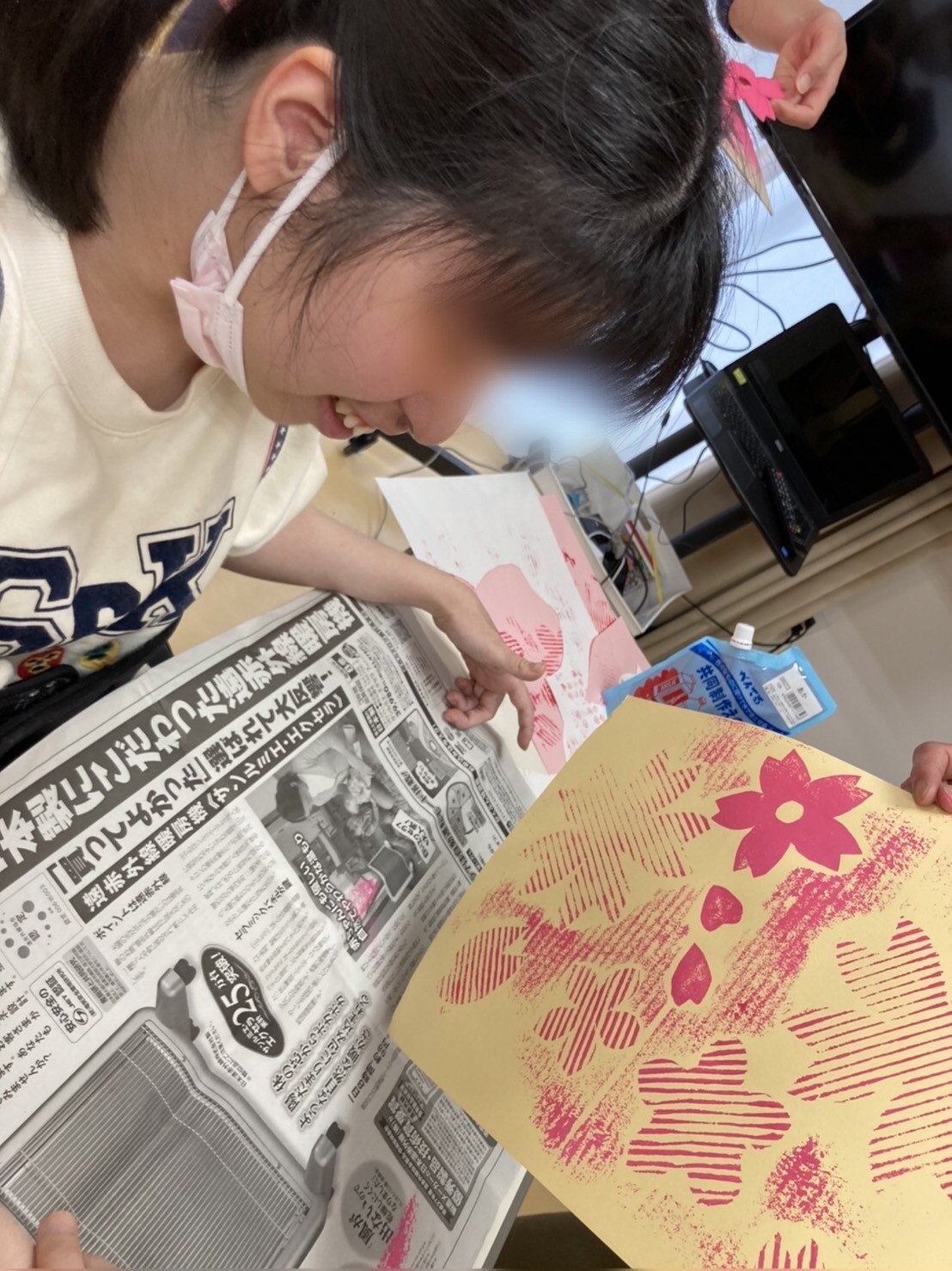 紙版画でお花をつくり、大きな紙にペタペタ貼り付けて…