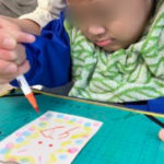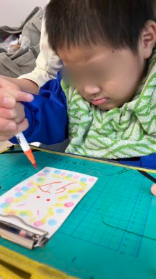 来年の年賀状をつくりました。スポンジのりに絵の具を混ぜて、干支のうさぎをステンシルの技法で表し、「卯」とカラー筆で書きました。スタッフと一緒にかわいい年賀状を完成させ、家の人に宛てて出しました。お正月に届いたでしょうか?