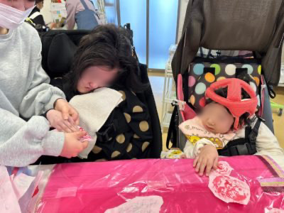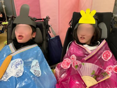 お雛様とお内裏様に扮して写真を撮ろうと、衣装を手作りしました。野菜スタンプで着物の柄を作り、ピンクと青のビニールに貼りました。冠や尺などの小道具を持ち、二人並んでパチリ。みんなとってもかわいく記念の写真が撮れました。ひなつり当日3日には、白酒ならぬ甘酒を味わってお祝いしました。